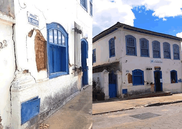 Além da visível “flambagem” na coluna (madeira), possivelmente comprometendo a segurança e integridade do imóvel – várias trincas pelo casarão são avistadas.